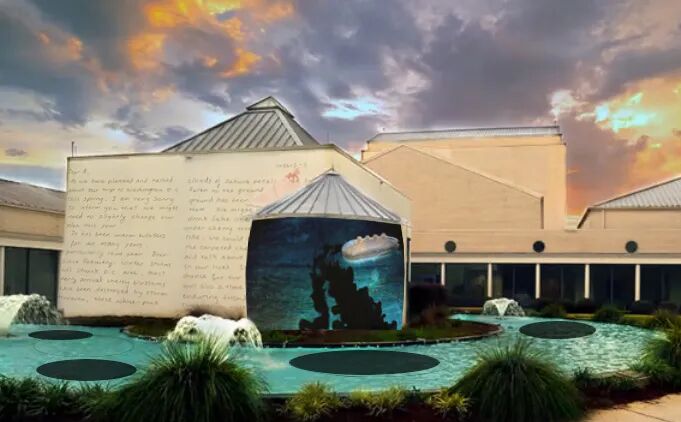 这个气候正义项目引用了与圣何塞市相关的水。我们的学生从世界各地移民,音轨回荡着用多种语言讲的爱情故事。表现了当地人与我们共同分享的全球这片公共领域,制造在海洋上的相遇。将胶片投影到外部画廊立面上的提案,佛罗里达州彭萨科拉大学,2017年。照片:Robin Lasser