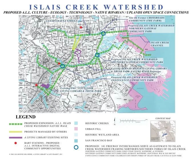 我不知道的是,我也正在与我未来的工作发生关联:从1974年开始,十字路口社区(农场)将成为一个土地改造的先驱,享誉国际的都市农业,生态,多元艺术和教育中心在一片被遗弃的邻近的碎片化的土地上,在高速公路和立交桥的夹缝中,形成了一个新的城市农场公园,并成为美国最早的替代艺术空间之一;Islais Creek流域的北框,我至今仍在研究之中;拟议中的Islais Creek分水岭北部门户社区公园位于目前被洪水泛滥所困扰的101号公路交汇处;由于高速公路的建设,几年后我才意识到,自己实际上一直坐在Islais Creek,真相逐渐浮出水面。之前和之后:Crossroads社区(农场)?1976 –之前/?1980 –之后Bonnie Ora Sherk在1990年代中期,我开启了自己的另一个项目,是在四所公立学校,毗邻的地点开发OMI / Excelsior生活图书馆和思想园。当时我受到了校长的邀请在中学发展图书馆。在吸引了数百名学生和社区成员参与的总体规划过程中,我们发现了一些旧地图,这些地图显示了其中一所学校(Balboa)高中的所在地,伊斯莱斯(Islais)港湾在其下流淌。这导致这所学校的食堂遭到大量洪灾,必须关闭,这条河流同时淹没该地区的许多房屋。然后,我意识到我的工作与“农场”的关联性,它们都处于同一个流域,这不是有意设计的系统工程,而是基于一种宏观上的同步性所展开的。这再次证明了,就像我静止不动一样,它们保持了一致,这是艺术与水这两股团结的力量。从那以后,在分水岭的上游,OMI / Excelsior生活图书馆和思想公园,结合了我的项目,即生活图书馆(ALL),这是一个由多种地方性分支组成的行星流派,旨在在全球范围内发展,并通Green-Powered Digital Gateways互连,并由我创立和领导的非营利组织Life Frames,Inc.赞助,它已经扎根,成长并蓬勃发展。多年来,这里的所有人一直与成千上万的学生(PreK-12)和社区合作,边做边学习,将土地转变为生态仙境和学习区,其中包括沿河带和耐旱的本地人。以及有机水果,蔬菜,花卉和药草园等元素。