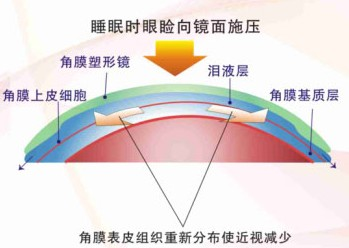 这种镜片是一种特殊逆几何设计的吻合矫形角膜接触镜,配戴在角膜上通过对角膜产生的持续性的按摩和压迫,以改变角膜表面的形态,降低眼屈光力。