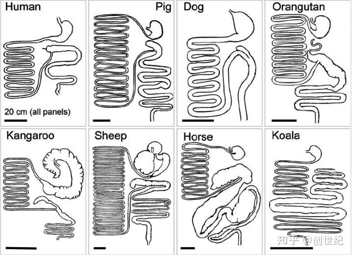 如果是前者造成的,只能说明食物的营养价值不高,需要我们不停地狂吃狂吃狂吃,才能补充日常基础代谢所需要的营养。我们会在吃上边花费大量的时间,所以注定是没有时间发展文明的。同时我们也可以大胆怀疑这种现状下的人类是没有文明的。为什么这么说呢?这种情况下我们的食物中,肯定是没有高热量的食物搭配的(比如脂肪,蛋白质,淀粉)。也就意味着,很可能我们还没有掌握饲养动物,种植经济作物这些基本技能。我们的大脑也更不允许那么发达,发达的人类大脑每天会消耗20%的能量,对于没时间思考的人类来说,耗能这么高的大脑完全是负担。人类消化道和其他动物的对比