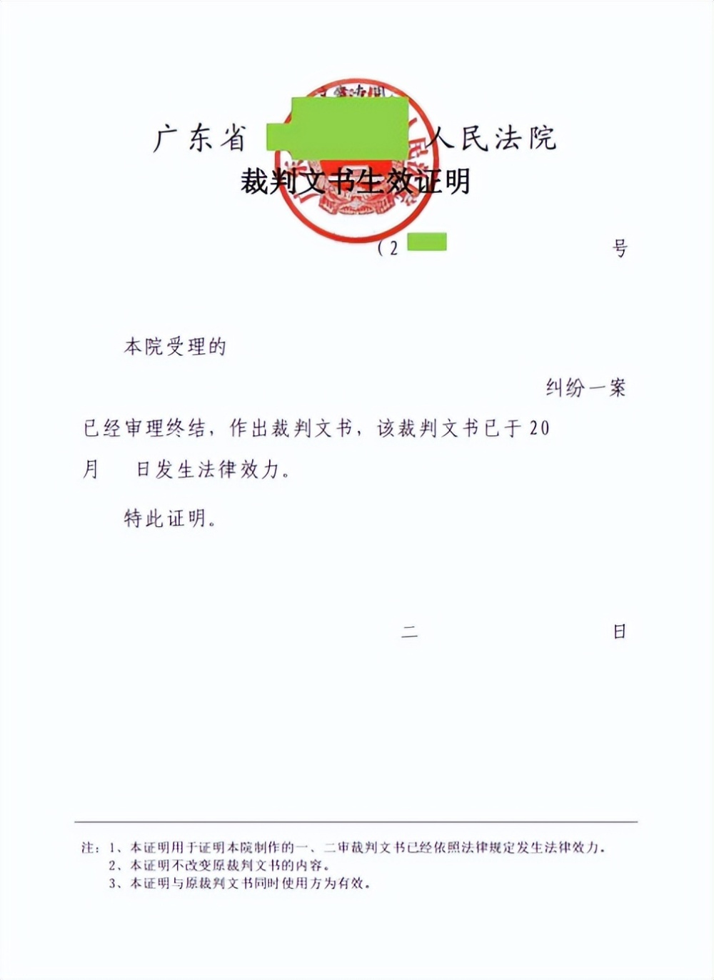 (图为笔者经办案例的“生效证明”,就相关隐私部分已做处理)