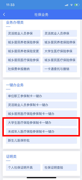 符合条件的大学生、未成年人未参保城乡医保的,可通过“大学生医疗保险参保制卡一键办”、“未成年人医疗保险参保制卡一键办”模块办理城乡医保参保登记、制卡资格审核、制卡领卡、开通代扣等一条龙业务。