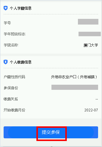 2.核对个人基本信息、学籍信息、缴费信息,确认无误后,点击提交参保;提示“提交成功”。