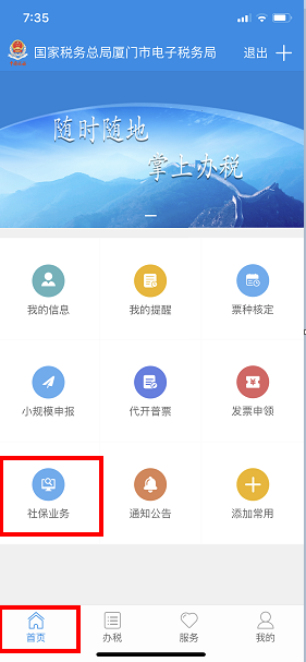 登录厦门税务APP,下方点击首页,选择社保业务。