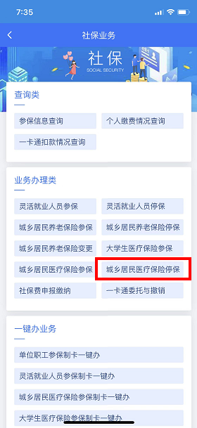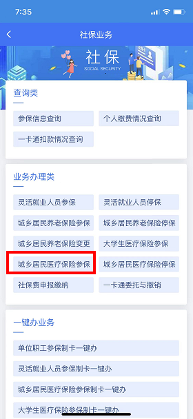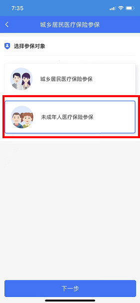 进入社保业务页面后,在业务办理类中点击“城乡居民医疗保险参保”;选择参保对象“未成年人医疗保险参保”,点击下一步。