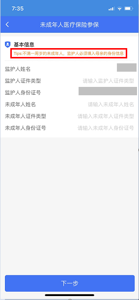 2.进入参保人基本信息填写页面后,录入基本监护人及未成年人的基本信息后,点击下一步。