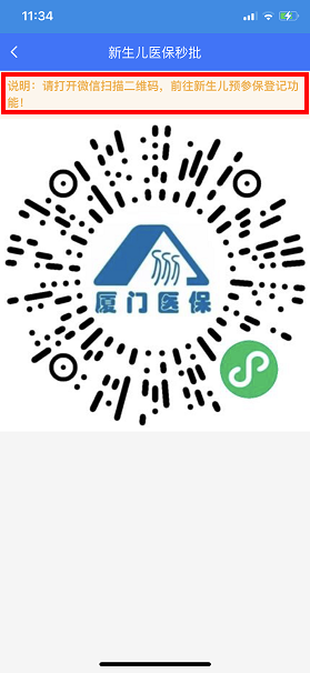 在社保业务首页,点击“新生儿医保秒批”;选择保存图片,打开微信扫描二维码,跳转至厦门医疗保障局小程序,选择新生儿预参保登记功能。