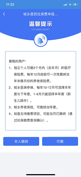 2.有本人缴纳和代缴选项,选择后,在界面中选择费款所属期起止,点击查询。勾选需要申报的保险费,点击申报缴款;选择支付方式后,跳转到支付界面。