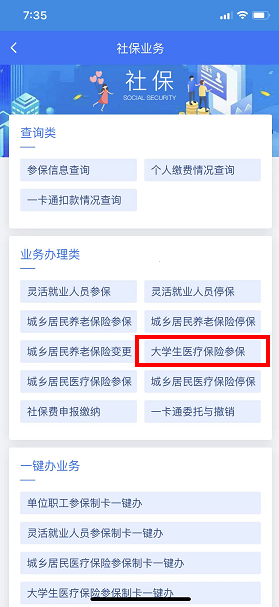 1.进入社保业务页面后,点击业务办理类 - “大学生医疗保险参保”。