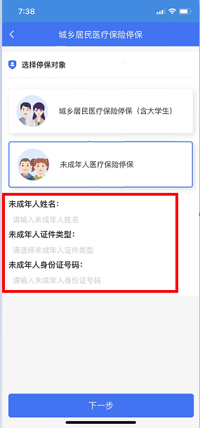 点击首页“城乡医疗保险停保”;选择“未成年人医疗保险停保”,录入未成年人姓名、证件类型、身份证号码等信息,点击下一步;核对信息,点击提交停保;跳出“是否确认停保”提示,选择“确认”。