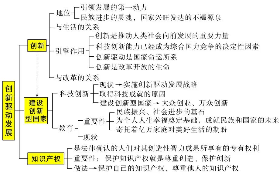 核心观点1.创新是引领发展的第一动力,是一个民族进步的灵魂,是一个国家兴旺发达的不竭源泉。(地位)2.创新是推动人类社会向前发展的重要力量。3.创新已经成为世界主要国家发展战略的重心。(易错点)4.科技创新能力已经成为综合国力竞争的决定性因素。(重要性)5.我国在尖端技术的掌握和创新方面打下了坚实基础,在一些重要领域走在世界前列。(易错点)6.从整体上看,我国仍然面临创新能力不强、科技发展水平总体不高、科技对经济社会发展的支撑能力不足、科技对经济增长的贡献率远低于发达国家水平等问题。(现状)7.我国坚持实施科教兴国战略、人才强国战略、创新驱动发展战略,努力建设创新型国家。(做法)8.建设创新型国家,要坚定不移地走中国特色自主创新道路。(做法)9.创新的目的是增进人类福祉,让生活更美好。10.坚持创新发展,必须把创新摆在国家发展全局的核心位置,不断推进理论创新、制度创新、科技创新、文化创新等各方面创新。(做法)11.一个民族创新能力的提高离不开创新人才的培养。12.要敢于创新、善于创新,把创新热情和科学求实的态度结合起来,努力使自己成为具有丰富创新能力的高素质人才。(做法)13.青少年要培养创新精神,努力提高自身素质。14.教育是民族振兴、社会进步的基石,是提高国民素质、培养创新型人才、促进人的全面发展的根本途径。(重要性)考点一:创新 1. 创新的地位 (1)创新是引领发展的第一动力。(2)创新是一个民族进步的灵魂,是一个国家兴旺发达的不竭源泉,也是中华民族最鲜明的民族禀赋。 2. 创新与生活的关系 (1)生活处处有创新。生活中的点滴创新改变着我们对生活的惯常看法。(2)创新是一种生活方式。(3)生活的各个领域都需要创新,也都可以创新。(4)创新让生活更美好。我们的生活将因创新变得更加便捷、舒适和丰富多彩。 3. 创新对个人的影响 (1)创新给我们带来惊喜,让我们获得成就感。(2)创新点燃激情,让我们的生命充满活力。(3)创新改变我们的思维方式和行为方式,让我们勇敢面对挑战,激发潜能,超越自我。(4)创新让我们获得更多的尊重和认可,让我们过上体面而有尊严的生活。 4. 创新的引擎作用 (1)创新是推动人类社会向前发展的重要力量。(创新对人类文明发展的作用)(2)创新已经成为世界主要国家发展战略的重心。在激烈的国际竞争中,唯创新者进,唯创新者强,唯创新者胜。科技创新能力已经成为综合国力竞争的决定性因素。(创新在国际竞争中的重要作用)(3)创新驱动是国家命运所系。实施创新驱动发展战略,推进以科技创新为核心的全面创新,让创新成为推动发展的第一动力,是适应和引领我国经济发展新常态的现实需要。科技创新是提高社会生产力和综合国力的战略支撑。(从我国民族复兴的角度提出创新驱动是必然要求和现实需要)(4)创新是改革开放的生命。我国改革开放事业进入攻坚克难的关键时期,更加呼唤改革创新的时代精神。(改革创新推动中国走向富强) 5. 创新与改革的关系