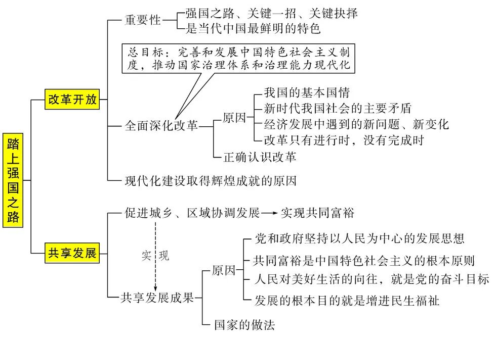 核心观点1.坚持改革开放,是我们的强国之路。只有改革开放,才能发展中国、发展社会主义、发展马克思主义。(易错点)2.改革开放是决定当代中国命运的关键一招,也是决定实现中华民族伟大复兴的关键一招。(地位)3.改革开放是当代中国最鲜明的特色。4.改革开放是党和人民大踏步赶上时代的重要法宝,是坚持和发展中国特色社会主义的必由之路。(地位)5.改革开放是中国和世界共同发展进步的伟大历程,不仅深刻改变了中国,也深刻影响着世界。6.改革只有进行时,没有完成时,将改革进行到底,开启全面深化改革的新征程,不断把新时代改革开放继续推向前进。7.全面深化改革的总目标是完善和发展中国特色社会主义制度,推进国家治理体系和治理能力现代化。8.改革开放以来,我国取得一切成就的根本原因:开辟了中国特色社会主义道路,形成了中国特色社会主义理论体系,确立了中国特色社会主义制度,发展了中国特色社会主义文化。9.中国开放的大门不会关闭,只会越开越大!10.促进城乡、区域协调发展是实现全面建成小康社会奋斗目标的一项重要要求。11.共同富裕是中国特色社会主义的根本原则。12.人民对美好生活的向往,就是党的奋斗目标。