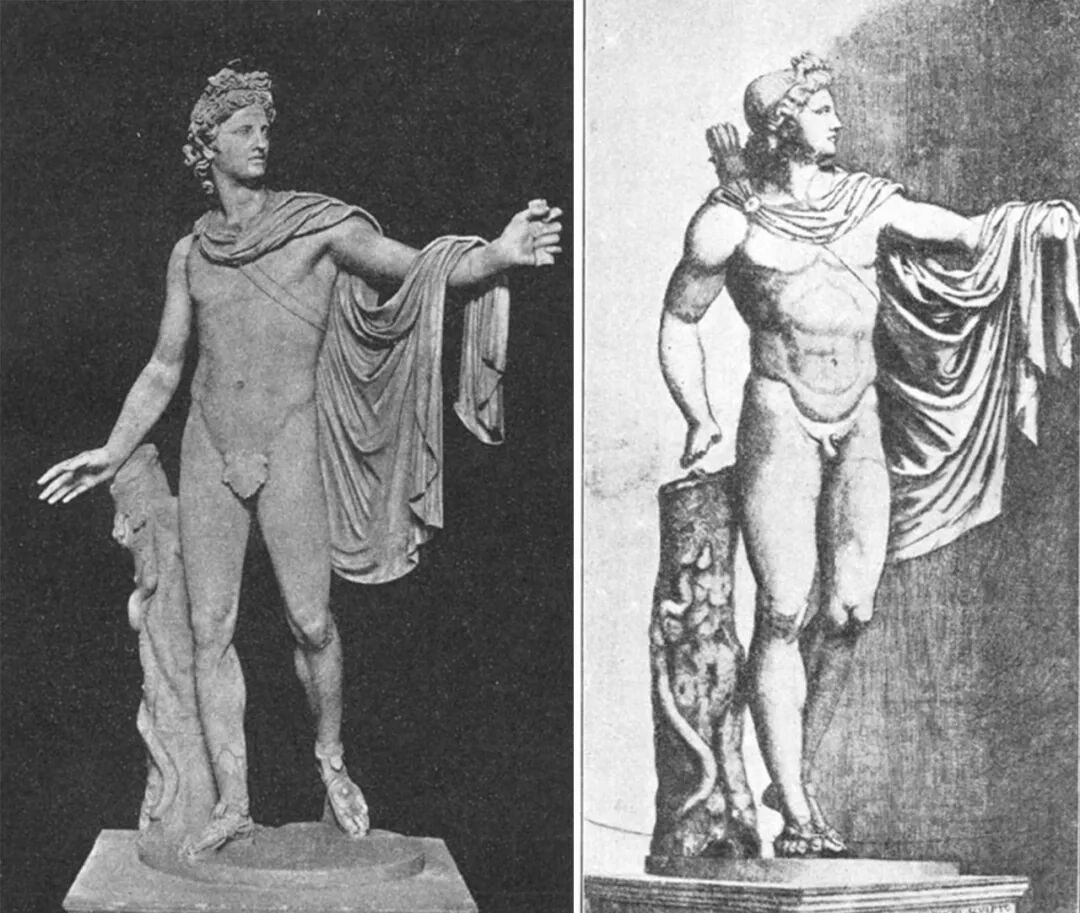 沃尔夫林对《贝尔维德尔的阿波罗》版画与照片的分析:左图为阿利纳利的照片,右图为马克·安东尼(Marc Anton,与 拉斐尔同时代的版画家)的版画。在梵蒂冈,看这座雕像时观者必须缩紧身子紧贴墙面,才能看到艺术家设定的特定视点— 版画表现的就是这个视点:阿波罗左臂线条延伸融入墙壁的平面,与观者平行;头部成为一个纯粹的轮廓,双脚锁定地面, 双目凝视前方,交汇的腿部线条赋予雕塑以稳定和冷静,同时没有减弱瞬间就要爆发的前行之势。沃尔夫林认为,摄影将 阿波罗的手臂表现为伸向观者“是不可容忍的错误”,致使原作的力量荡然无存;版画中,垂直线和水平线、手部和胸部形成犀利的对比,照片中那个蔫兮兮的躯干突然获得了一种梦幻般的力量,好像体内每一个粒子都充满了生命和能量。(参见 Heinrich W?lfflin: How One Should Photograph Sculpture.)