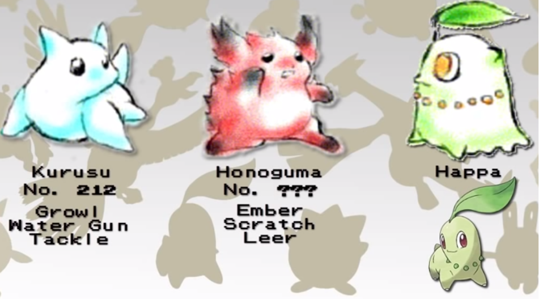 上图中为最开始的金银版“御三家”设定,与后来的菊草叶、火球鼠、小锯鳄的形象设定大相径庭,只有图中最右侧的绿色精灵和后来的菊草叶形象颇为相近,另外两只完全沦为了不折不扣的“废案”。
