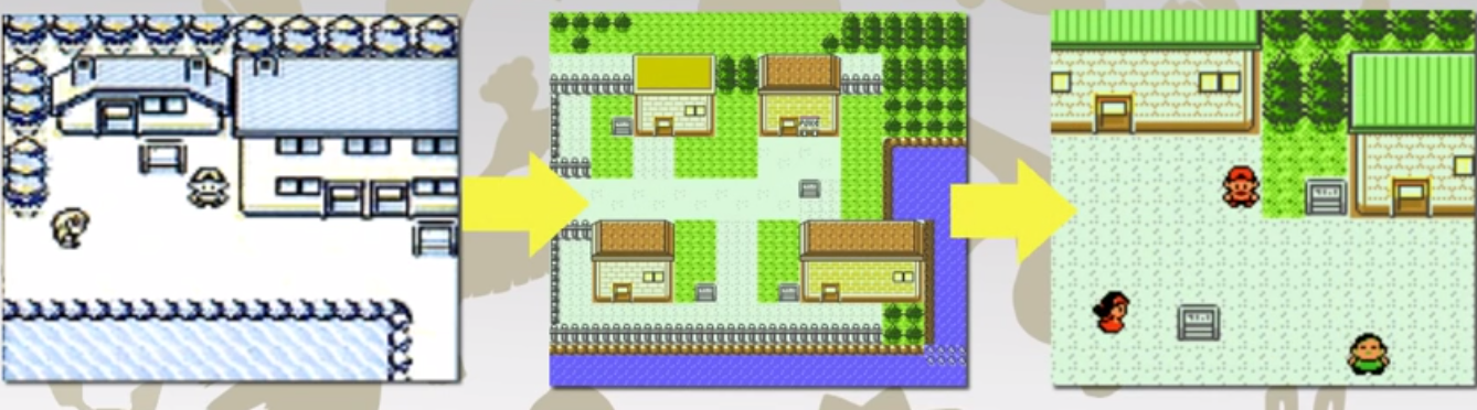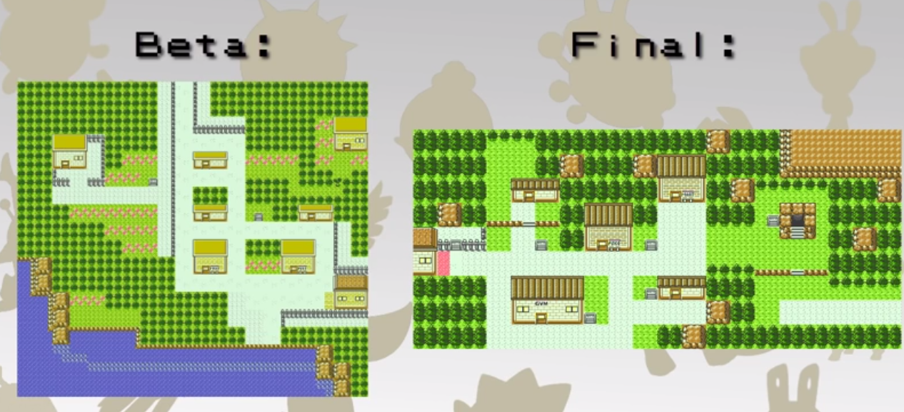 比如初始城镇若叶镇,原案中蓝色的色调+主角+小银并没有完全继承到游戏中,但是这个场景构图并没有完全废弃,经过α、β两个版本设计的变化,最终变为了金银版绿色调的若叶镇,房屋和水面位置都有了调整,然而镇子的大体面貌还是得到了保留。