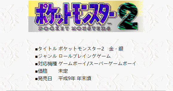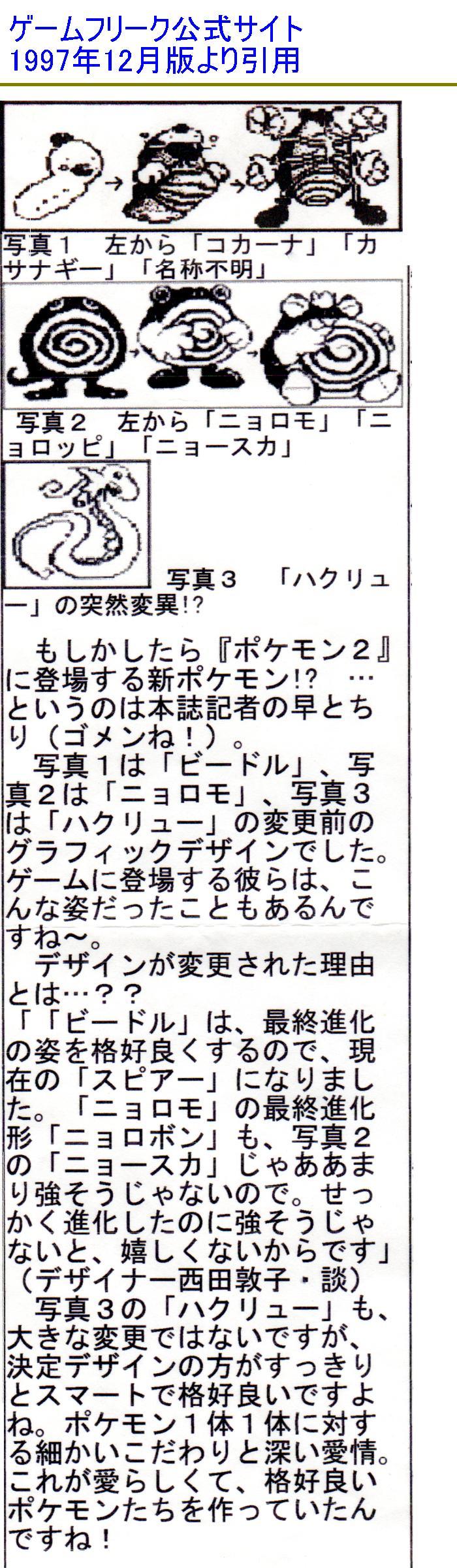 GBC上面的《Pokemon2 金/银》中,经历了多个版本的改变,导致最初的大量设定都没有被继承到最终的金银版游戏中,比如现在根本不存在的几只精灵: