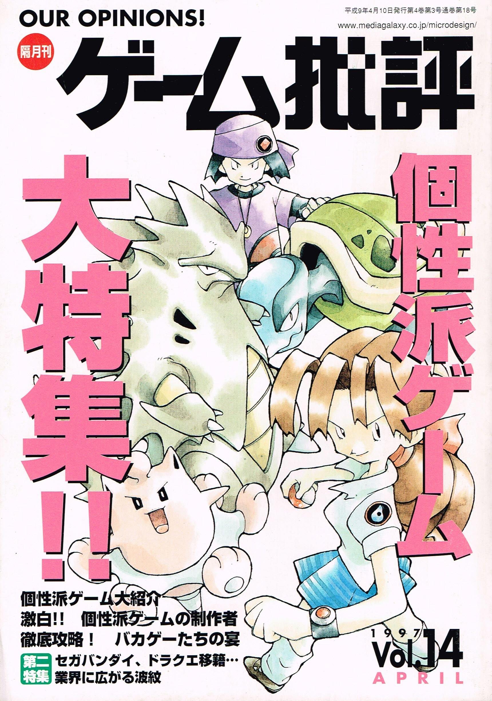 最早关于这个口袋妖怪的二世代续作,出现在一本名为《ゲーム批評》(《游戏批评》的杂志上),杂志封面包含了“金银版原作”的人物设定和精灵设定,以下是1997年4月,第14期《游戏批评》的封面,是最早的金银废案的设定,注意其中的除了班吉拉的两只精灵: