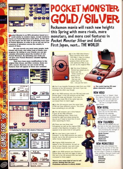 准确地说,这个时候还没有“金银版”这个概念,那个时候原作的名称为《口袋妖怪2》(《Pokemon2 金/银》),后期才改名为金银。而杂志封面上的内容已经很“劲爆”,出现了两个到现在都没有出现过的精灵。