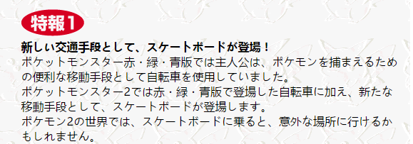 最初1997年特报中提出要增加交通方式,为训练师提供便利的交通方式,其中兑现了自行车,并且设计并保留了“单车路”这种场景和游戏元素,但是一度风传的滑板却并未上线。