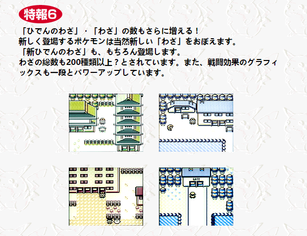 当然,精灵只是一个方面,“金银废案”和正式版发售中区别最大的一个方面则是场景,1997年公布的游戏原案中,特报6部分公布的几个场景,全部没有出现在正作中: