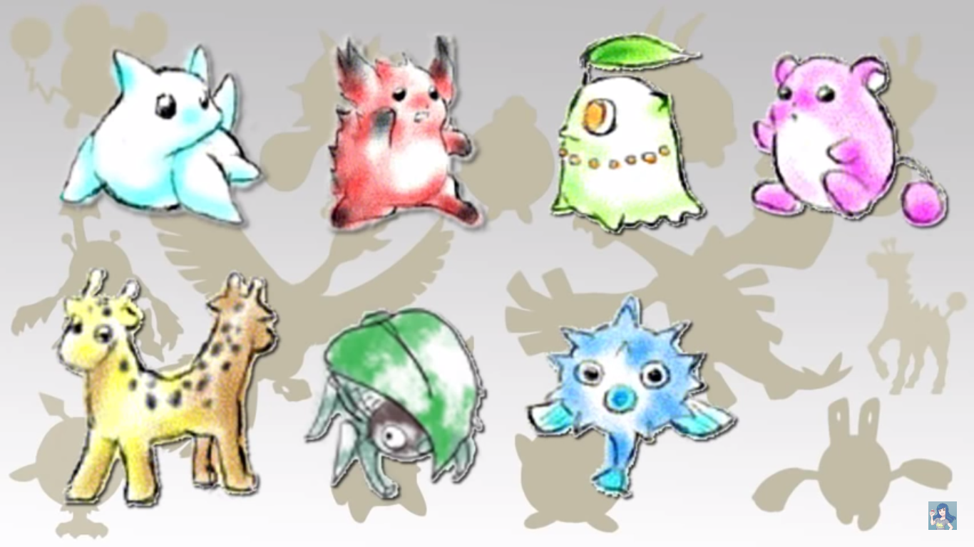 而除了御三家之外,还有更多的精灵成为“废案”,图中后四只精灵,第二行最左边的一只应该是麒麟奇的原案,而第二行最右边应该是千针鱼的原案,而第二行中间那只虫系精灵,则一直最终没有成为一个正式发布的精灵。