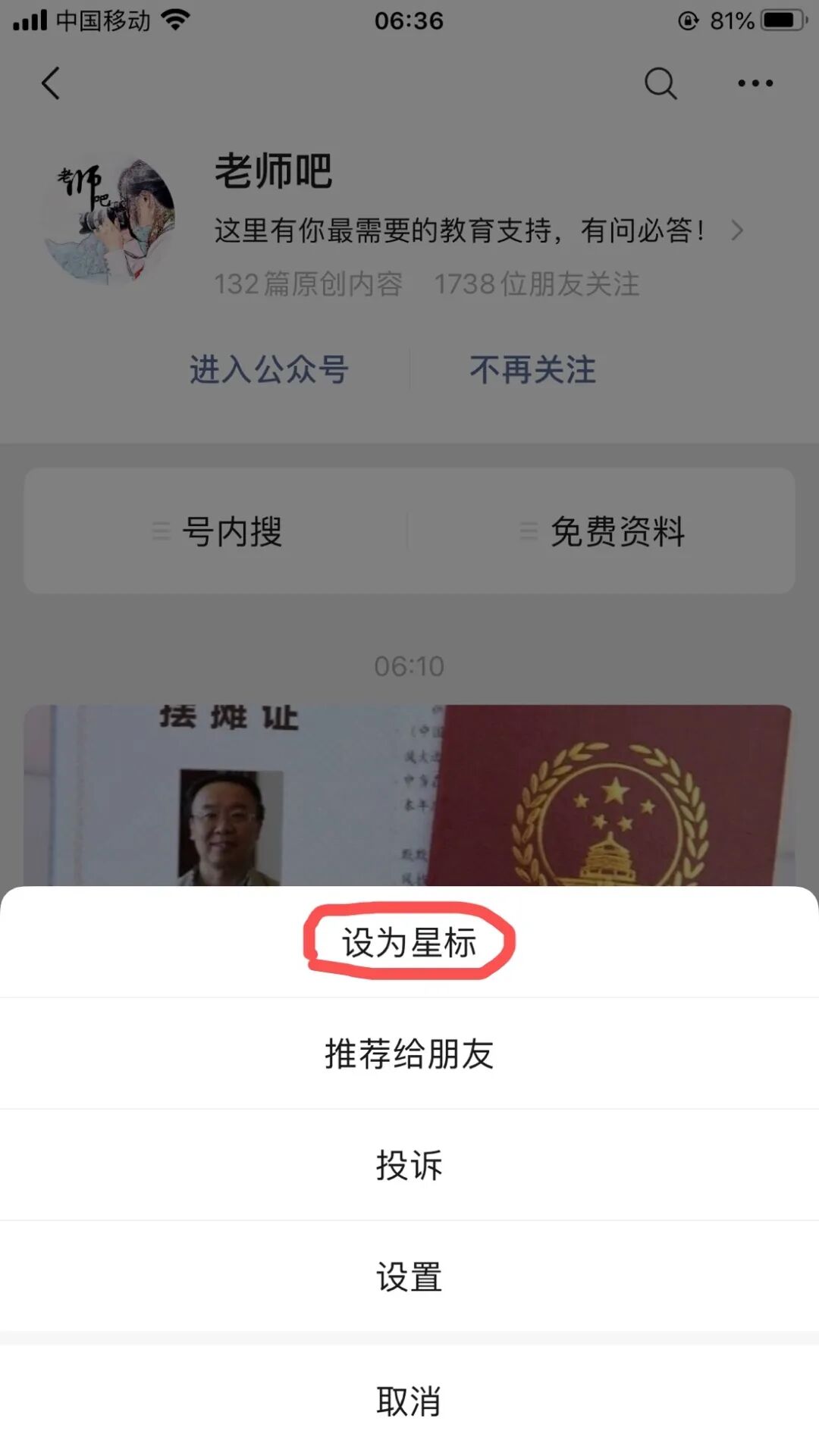 2.点文首?进入老师吧公众号,如下图点右上角●●●,把“老师吧”设为星标??;