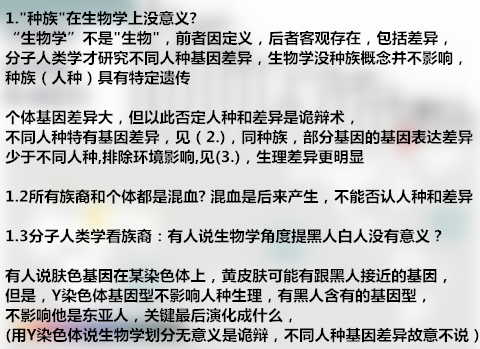 (用Y染色体基因型说生物学划分无意义是诡辩术,不同人种的基因差异故意不说)