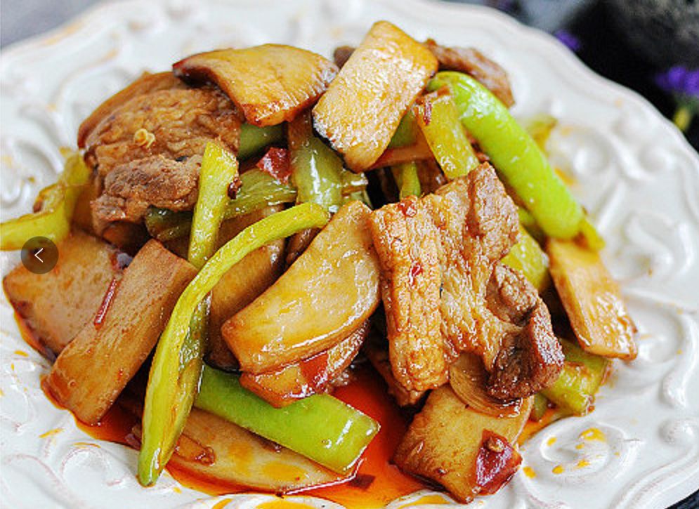 食材:猪肉 100克、杏鲍菇 2个、尖椒 2个、豆瓣酱 1小勺、生抽 少许、料酒 适量、植物油 适量。