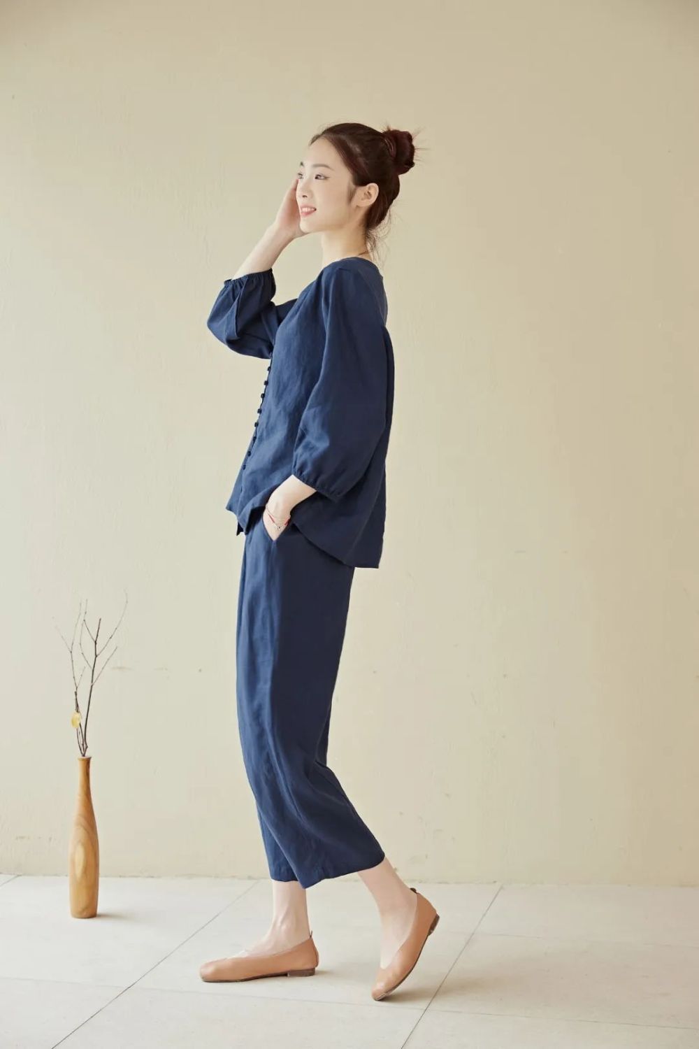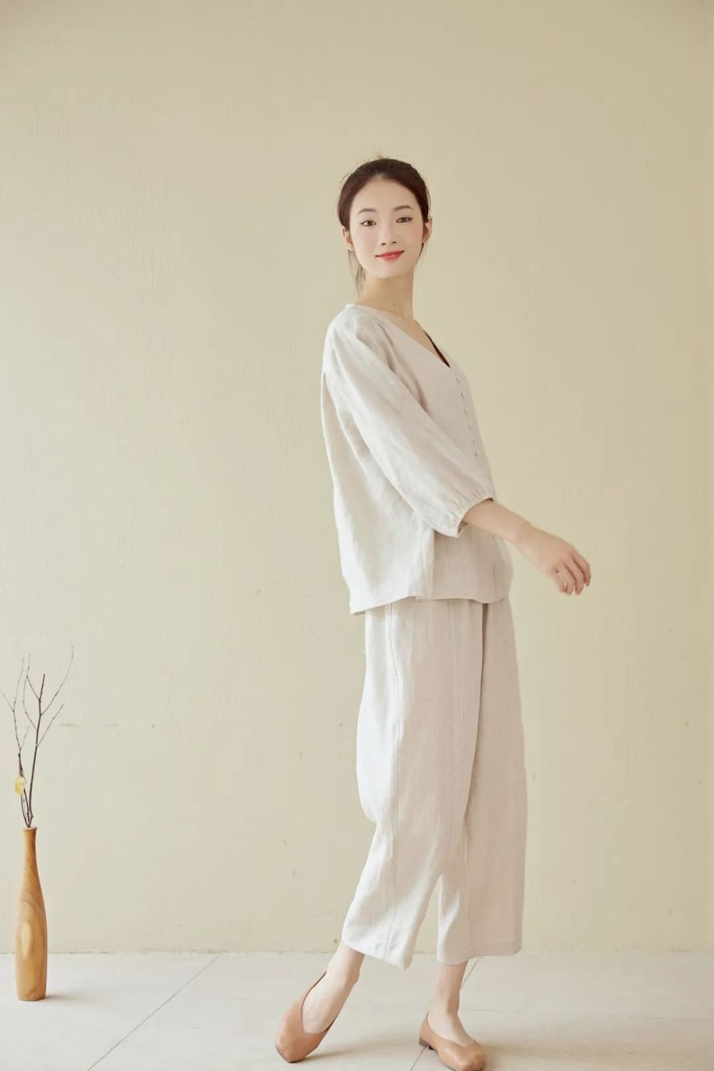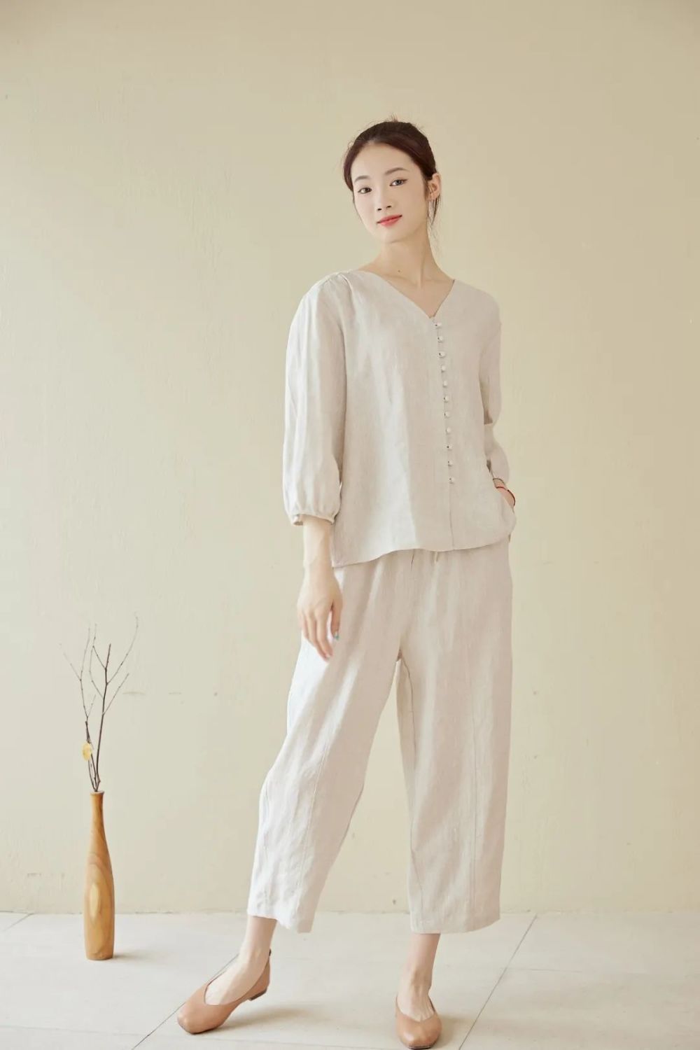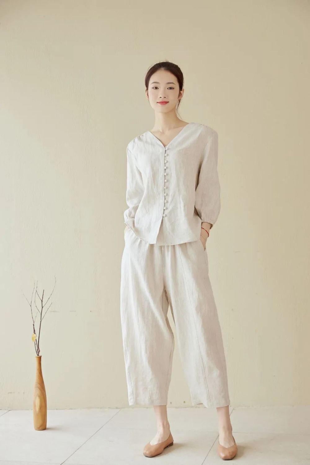 第二个系列要推荐的,是一款亚麻衬衫和裤装,质感高级又百搭,精良的剪裁、轻中式的设计,易穿搭、不张扬、显气质。
