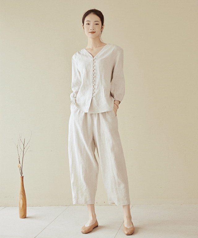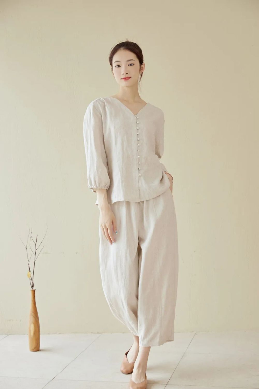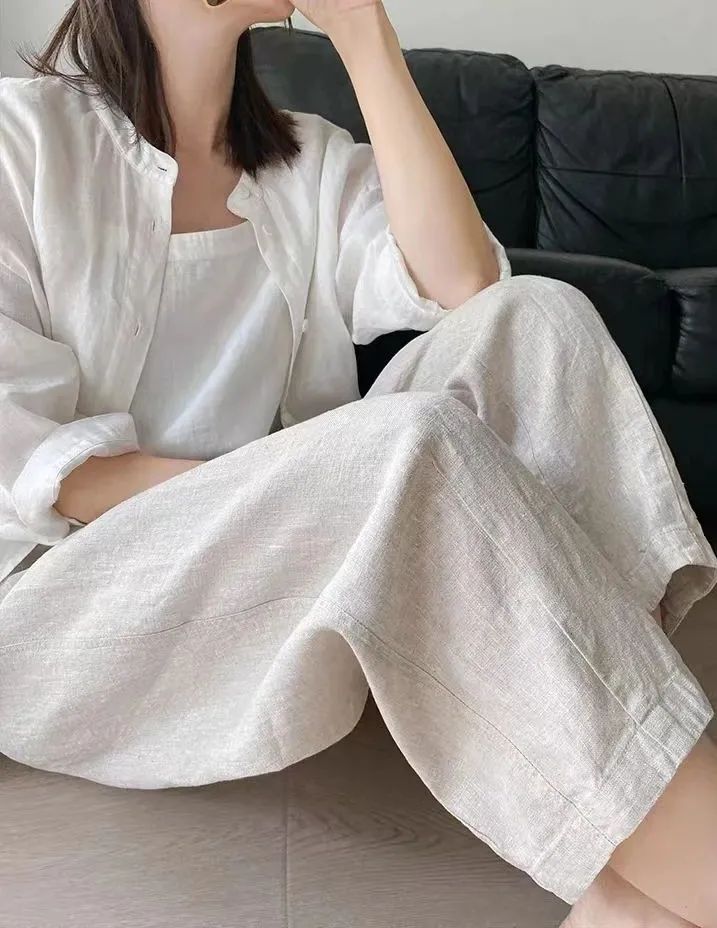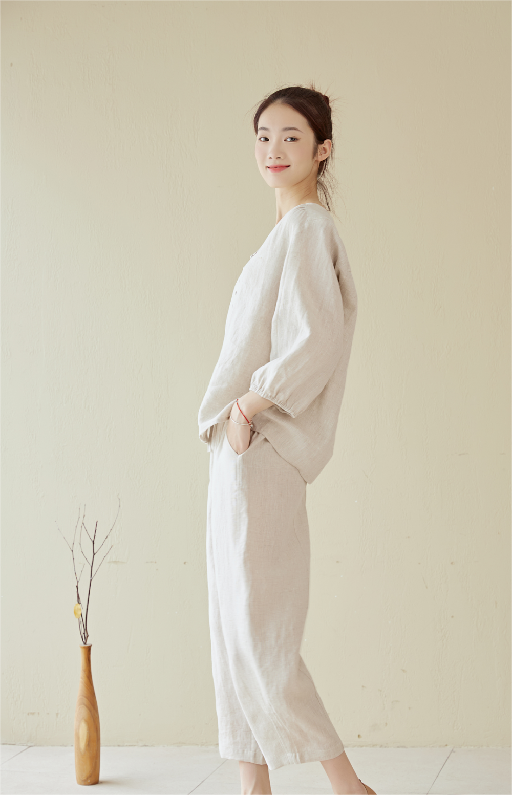 第二个系列要推荐的,是一款亚麻衬衫和裤装,质感高级又百搭,精良的剪裁、轻中式的设计,易穿搭、不张扬、显气质。
