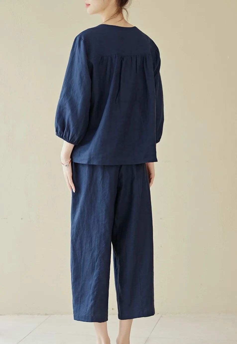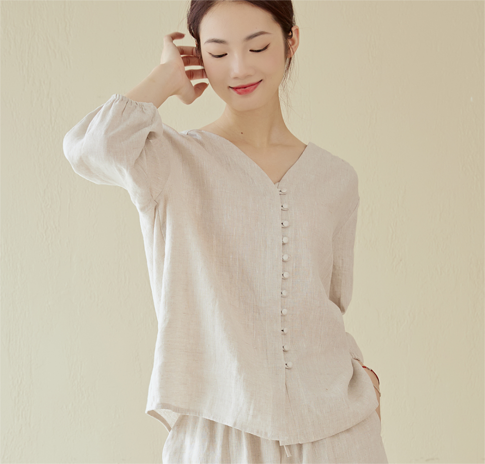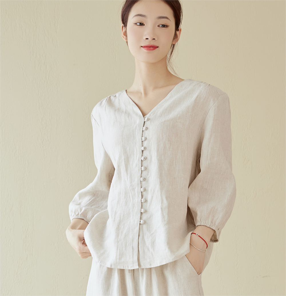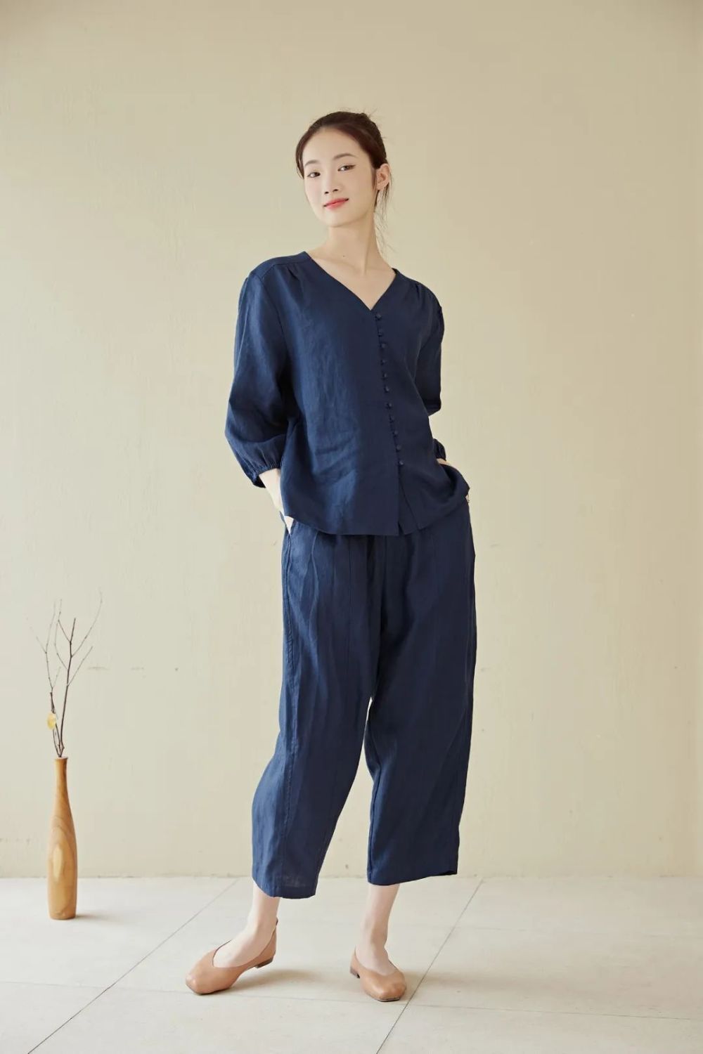 第二个系列要推荐的,是一款亚麻衬衫和裤装,质感高级又百搭,精良的剪裁、轻中式的设计,易穿搭、不张扬、显气质。