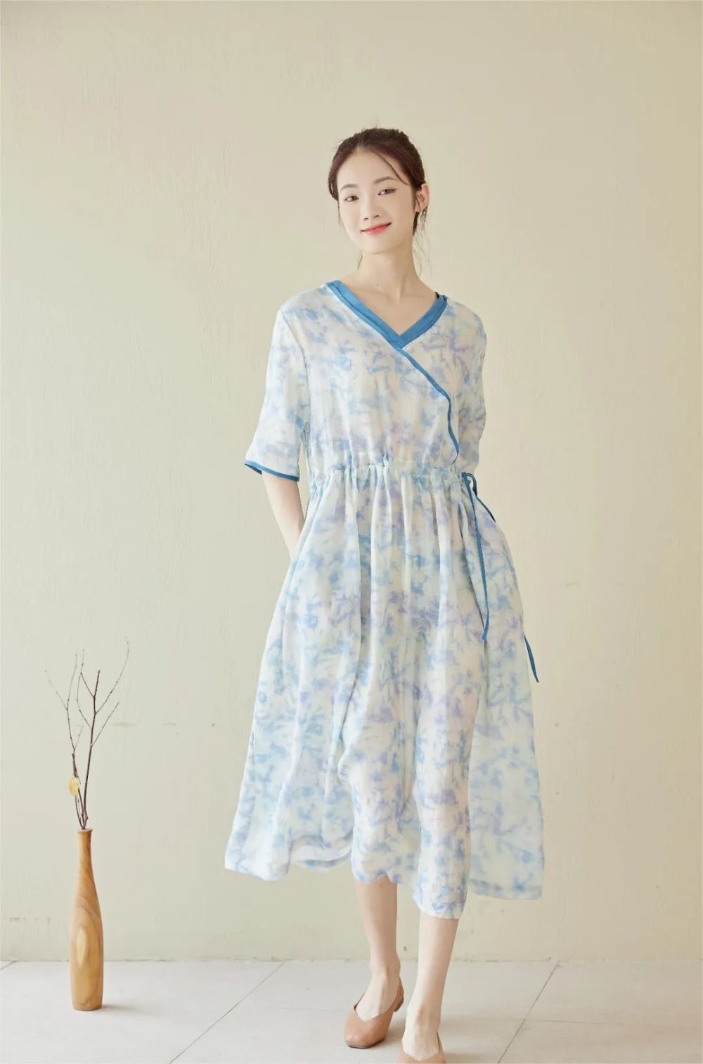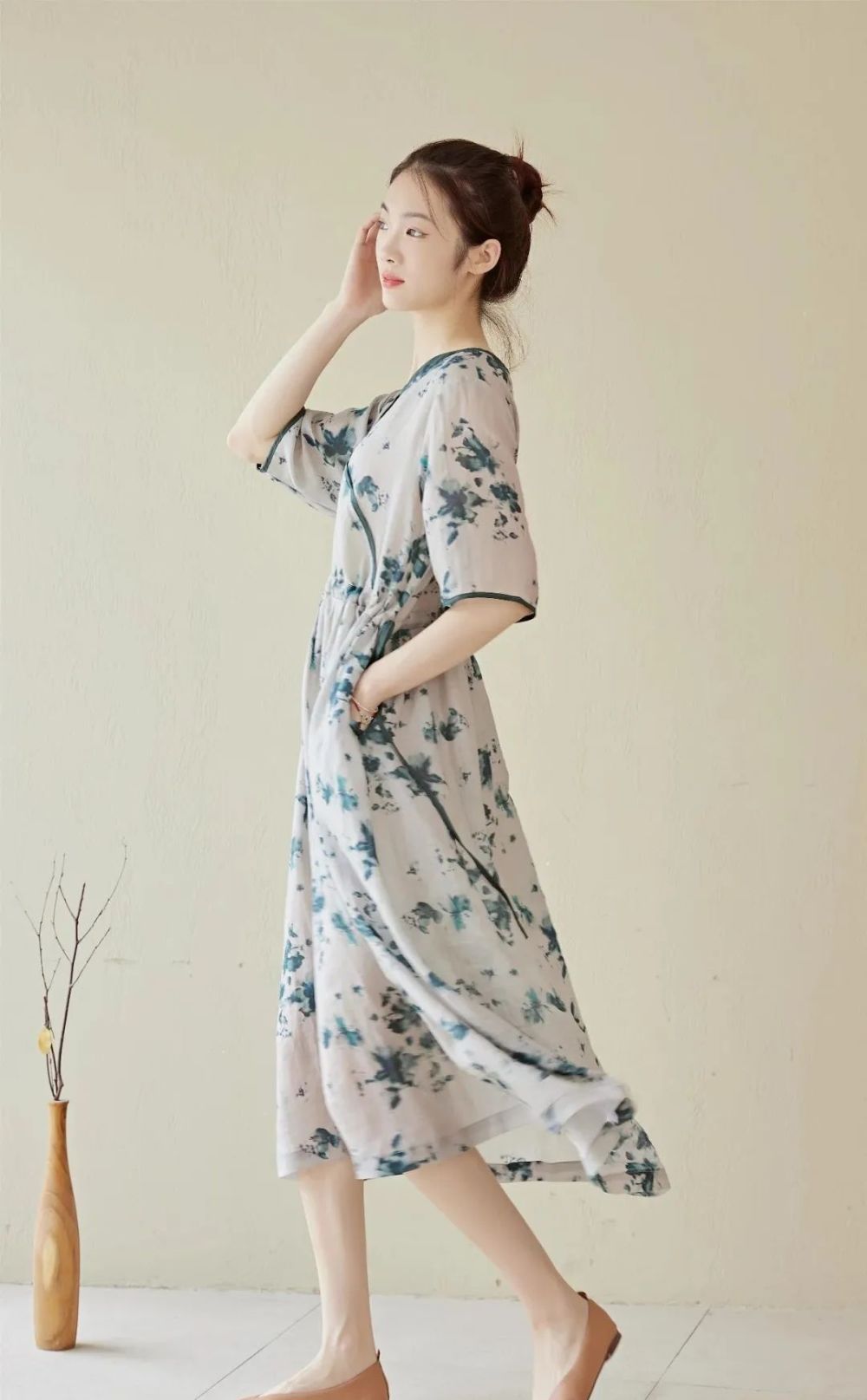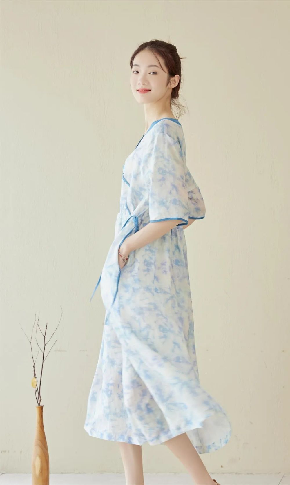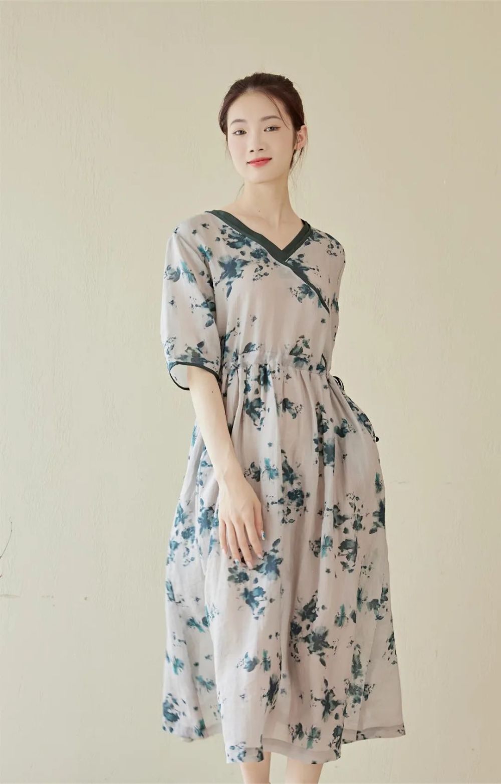 今天给大家推荐的这2款国风苎麻连衣裙,4款花型——水墨浸染、花系韵染连衣裙。