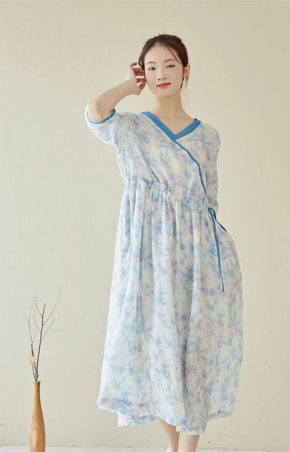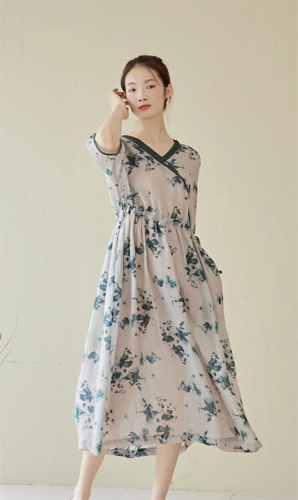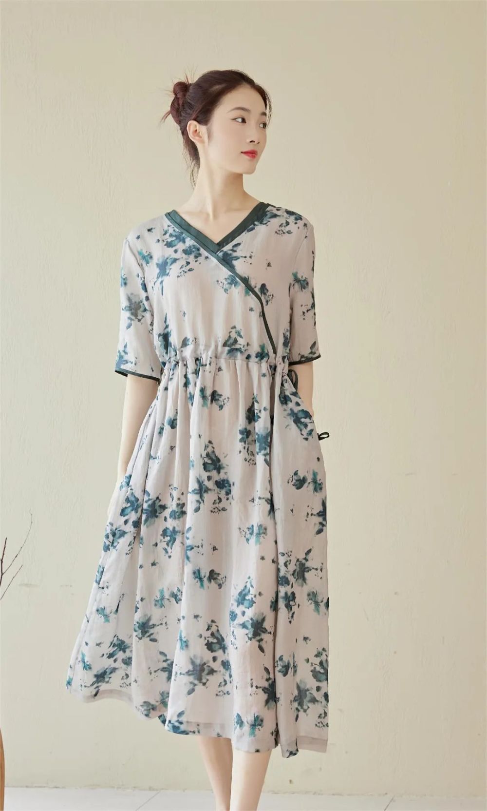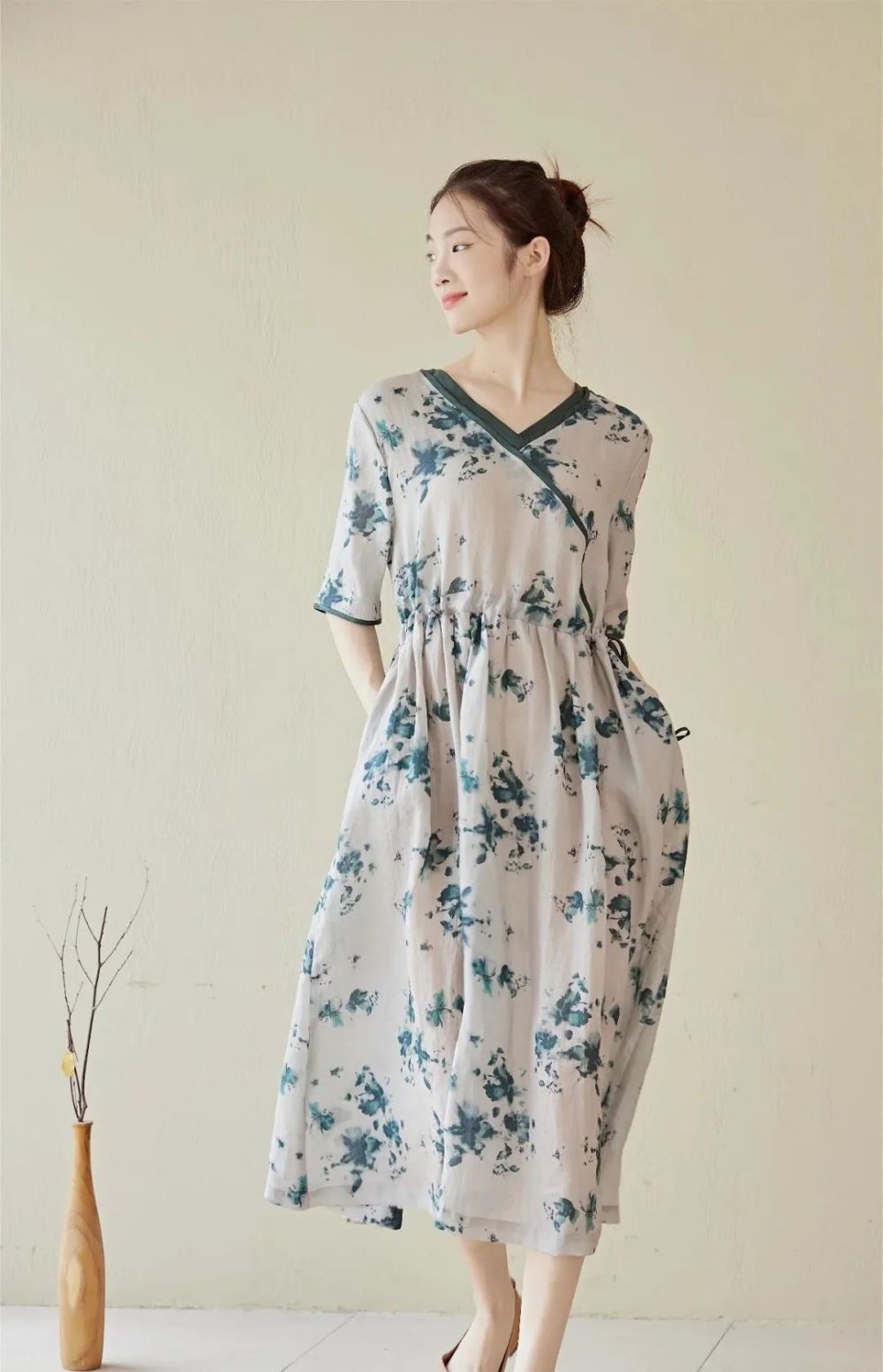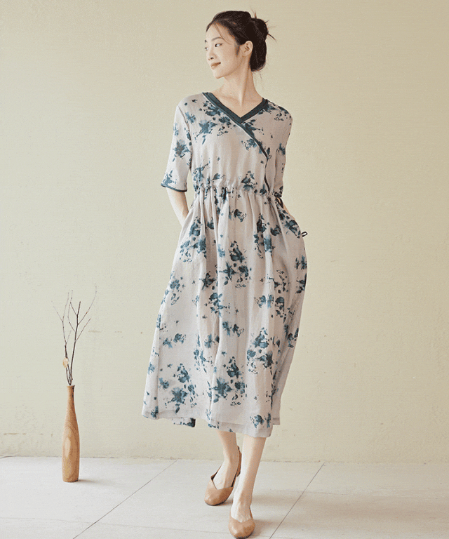 今天给大家推荐的这2款国风苎麻连衣裙,4款花型——水墨浸染、花系韵染连衣裙。