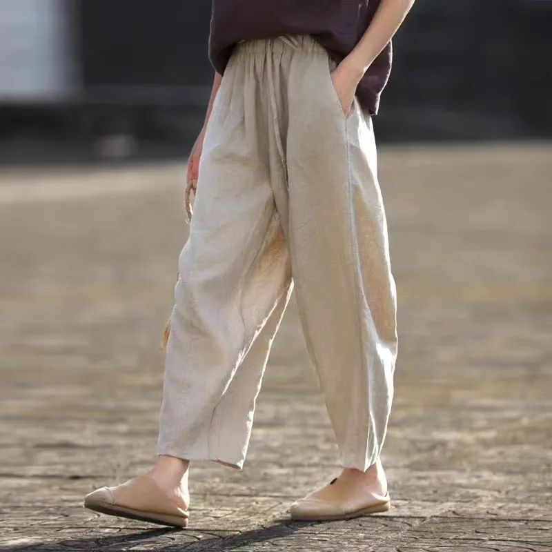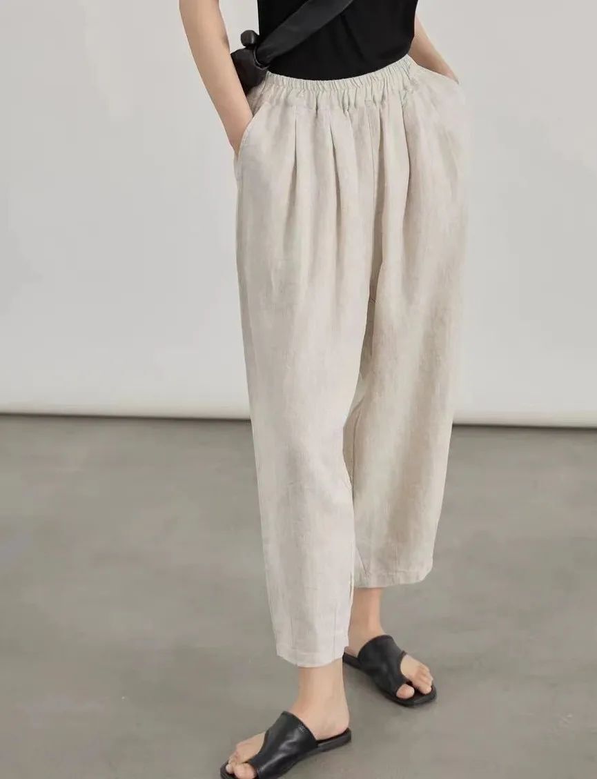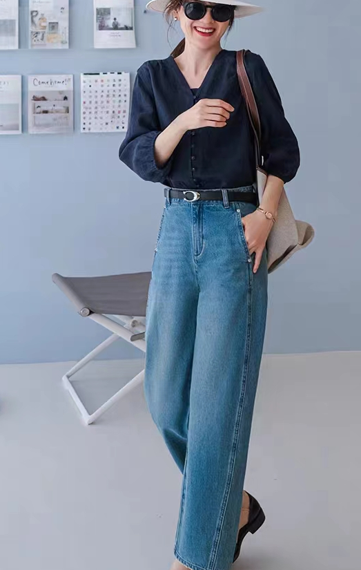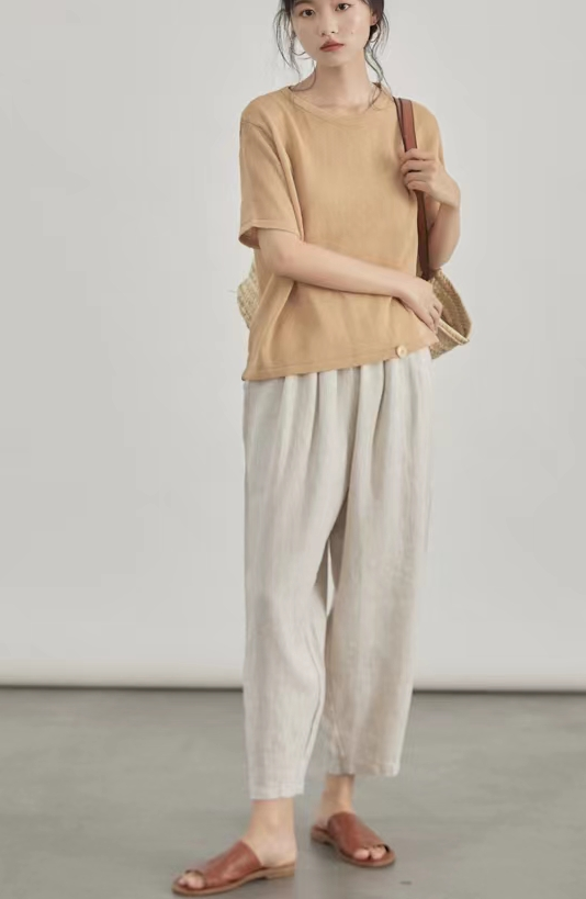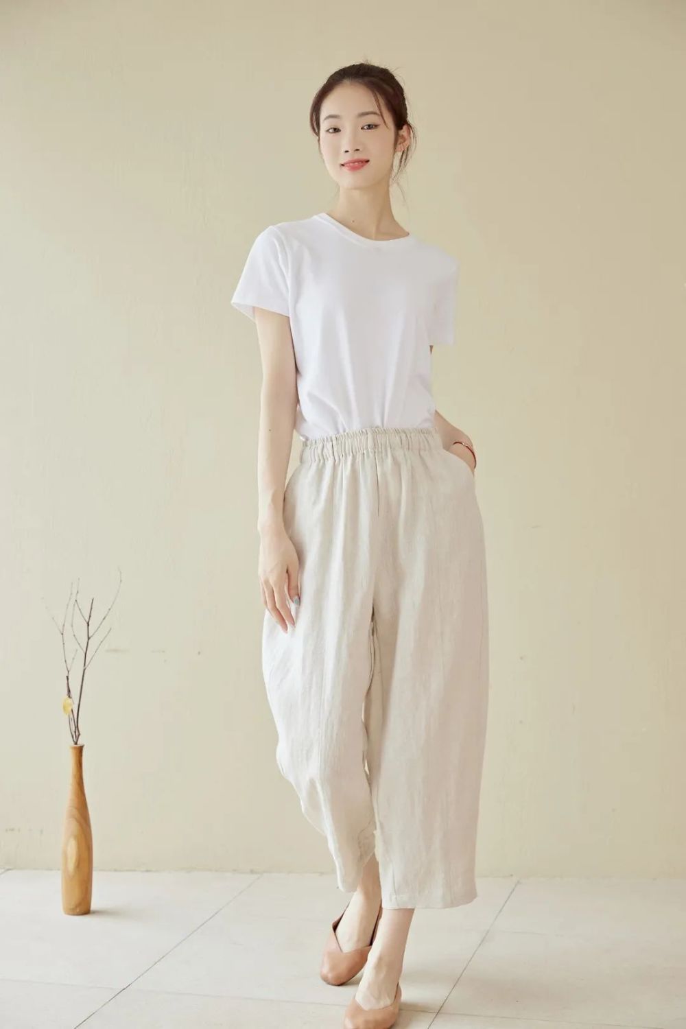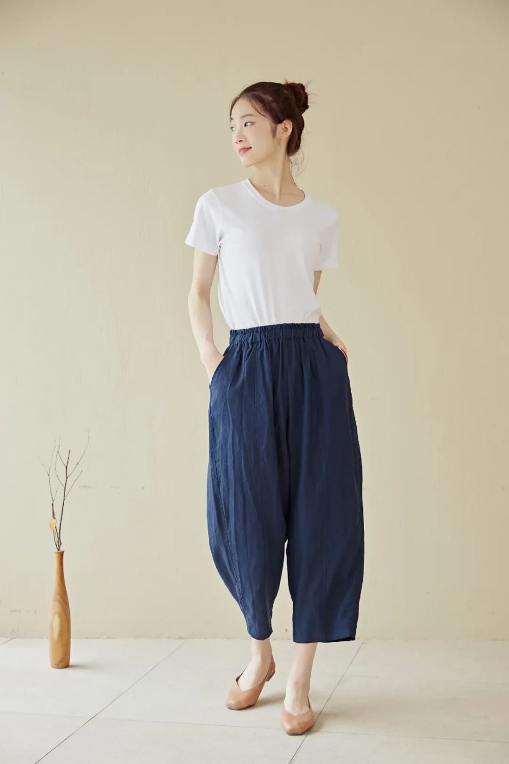这款亚麻九分裤,裤型直挺,结合中高腰设计,对不同身材都很友好。