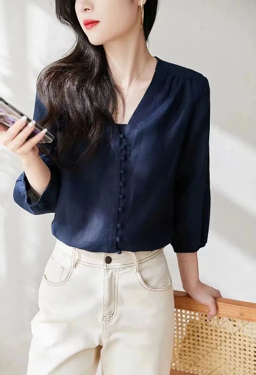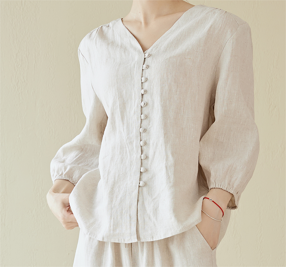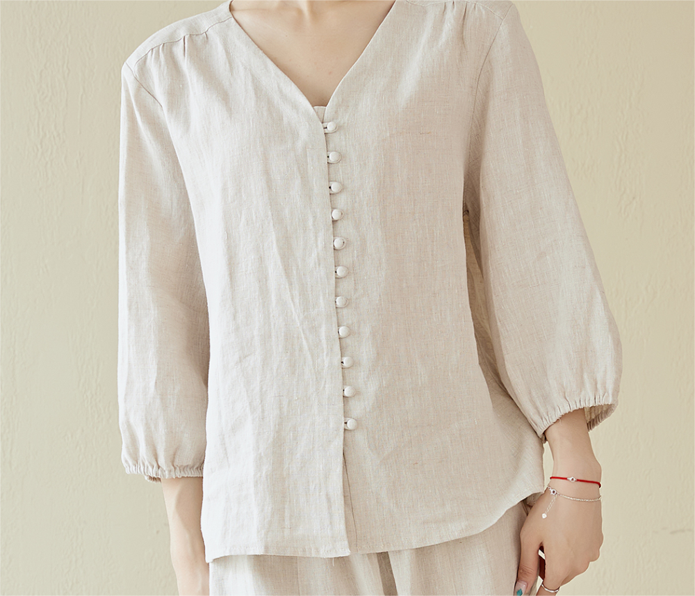 朴素的V领9分袖上衣,夏日的简约休闲单品。而在亚麻面料的表达之下,也渲染上了一层文艺的气息。
