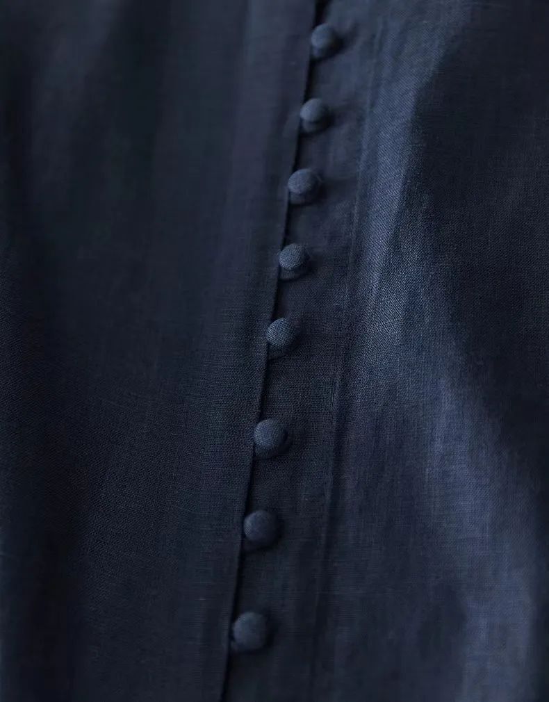 布料细密而不闷,亚麻天然自带疏松的纤维结构,穿上后有种两腋生风的感觉,特别舒爽凉快,所以亚麻还有个“天然空调”的美誉。