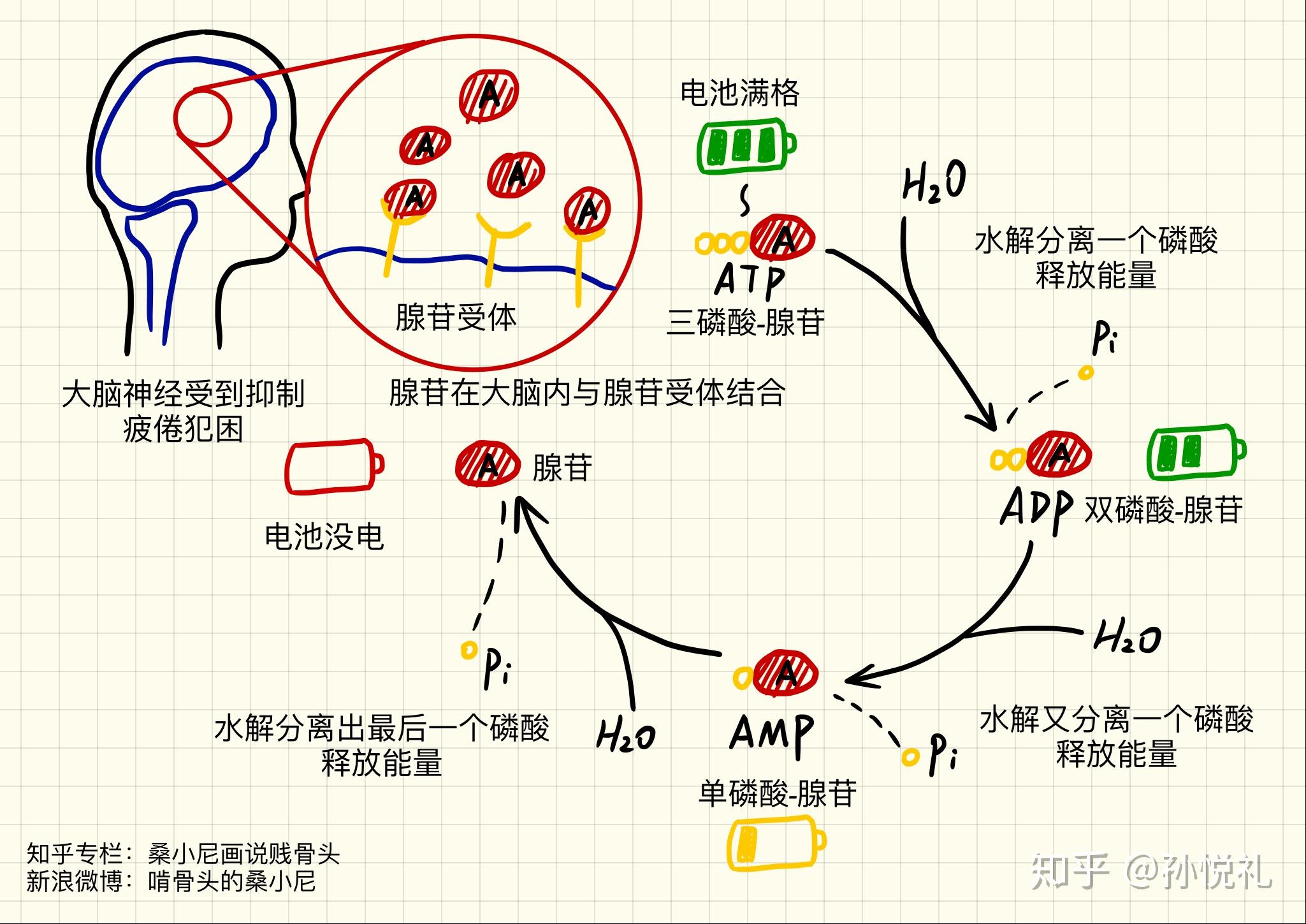人类的体力在日常活动会一点点被消耗,同时身体也会代谢出一种神经调节因子——腺苷,它的主要作用就是和腺苷受体相结合,给大脑传达疲劳信号。