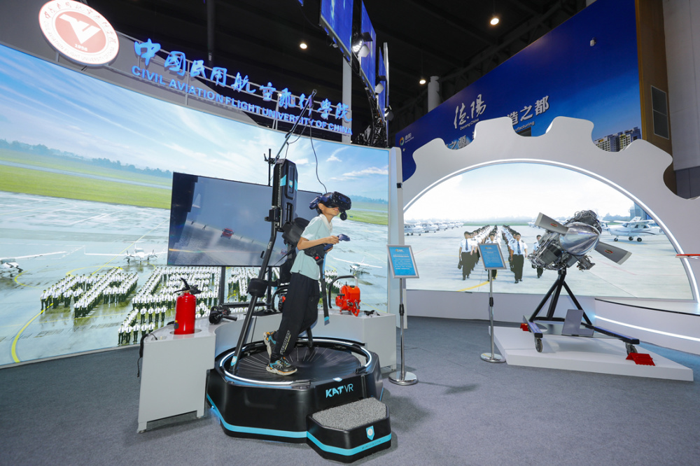 在第十九届中国西部国际博览会区域合作发展馆,一名参观者在中国民用航空飞行学院展区体验VR设备。新华社图片