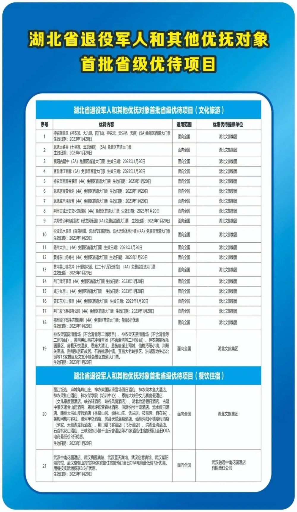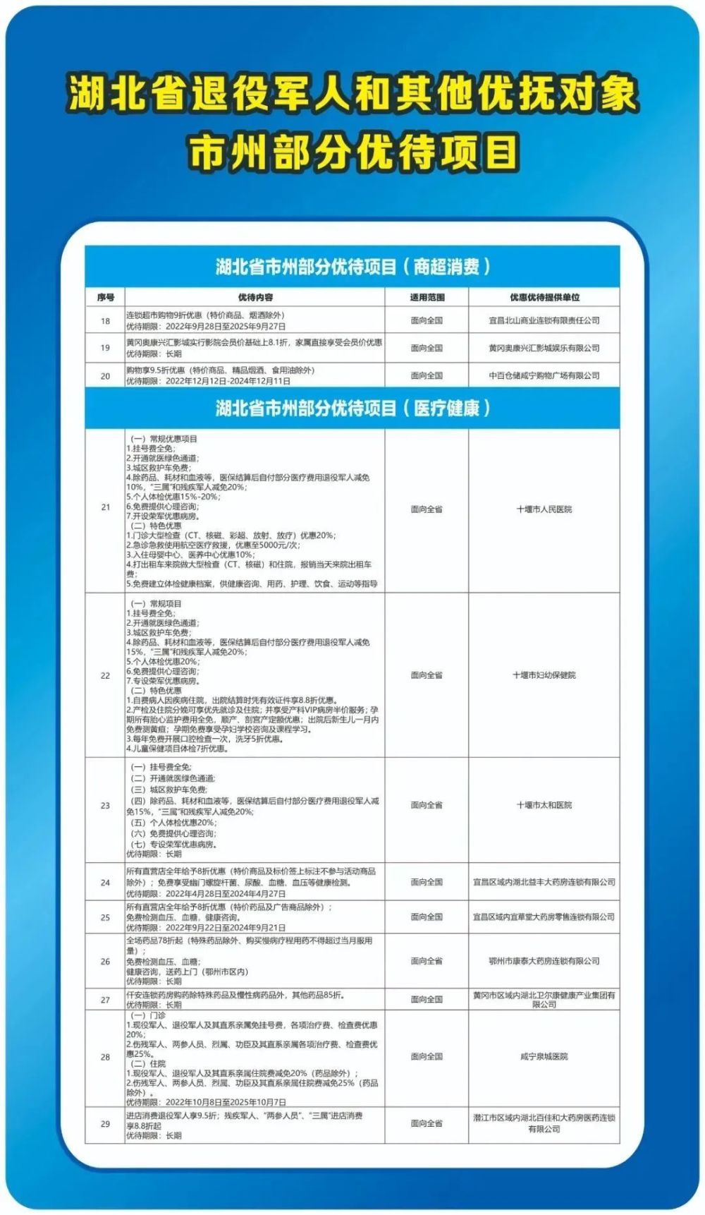 经企业申请,武昌区退役军人事务局审核,下列单位对持优待证的退役军人及其他优抚对象优惠项目如下:
