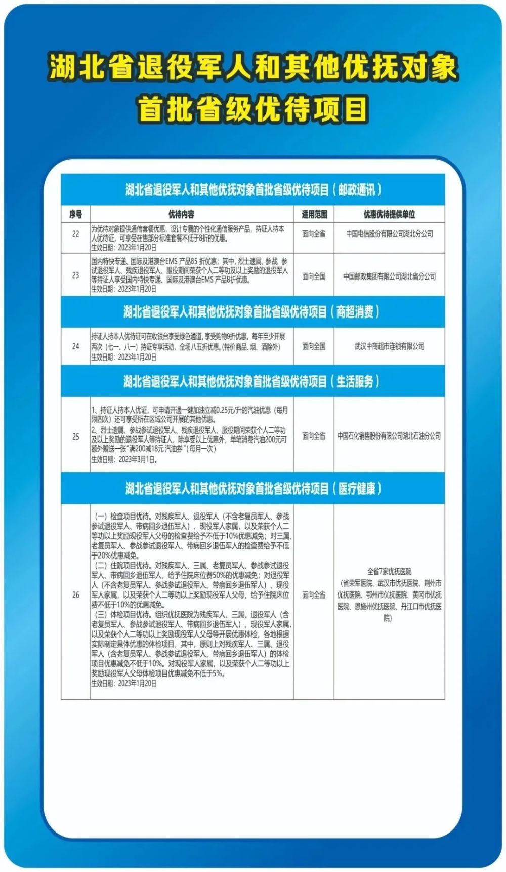 优惠项目:1.拥军优抚专线;2.专属理财产品;3.免除工本费、年费、小额管理费等多项费用;4.优享活动。