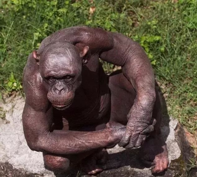 印度动物园内一只名叫“古鲁”的黑猩猩成了同类中的奇葩,因患罕见的斑秃症(Alopecia)毛发掉光