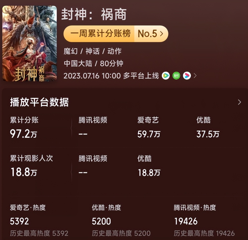 导致电影差评一片,根据票房网站统计《封神:祸商》首日分账票房为97.2万,这个成绩不好不坏,加上《封神第一部》即将上映,没准会给《封神:祸商》带来更多的热度,回本还是有希望的。