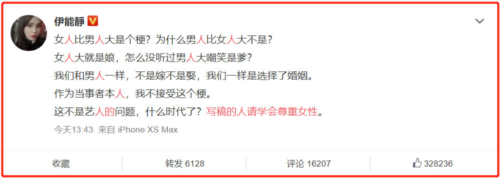 按理说,伊能静的反应十分合理,她有捍卫自己尊严的权利,怒怼写稿人让对方学会尊重女性也完全没问题。