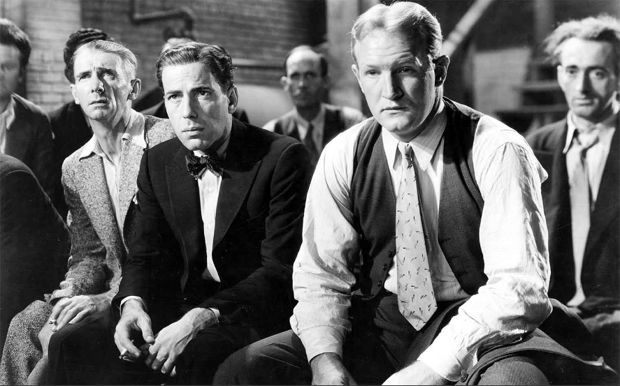《黑暗军团》之后,鲍嘉又回到了他的常规戏路,拍摄了威廉·迪亚特尔(William Dieterle)的《伟大的奥马利》(The Great O’Malley,1937)、劳埃德·培根(Lloyd Bacon)的《艳窟泪痕》(Marked Woman,1937?)、迈克尔·柯蒂兹(Michael Curtiz)的《脂粉拳王》(Kid Galahad,1937)和培根的《圣奎丁监狱》(San Quentin?,1937)。接着,在威廉·惠勒(William Wyler)的《死角》(Dead End,1937)中,他再一次取得了突破。这部影片并非华纳出品,而是由华纳出借给塞缪尔·戈德温的(Samuel Goldwyn,经典好莱坞时期最成功的独立制片人,他与威廉·惠勒合作了多部佳作)。同《化石森林》一样,这部电影也有舞台血统,改编自西德尼·金斯利(Sidney Kingsley)1935 年的百老汇热门同名戏剧,但鲍嘉并非该剧原班人马的一员。这部电影在一个巨大的布景中拍摄,将纽约的富人和穷人并置呈现(富人住在一座气势磅礴的摩天大楼里,由身强力壮的门卫[沃德·邦德 Ward Bond]守卫,而穷人则住在附近肮脏的廉租公寓中),整部影片是对社会不平等的犀利而绝望的观察。