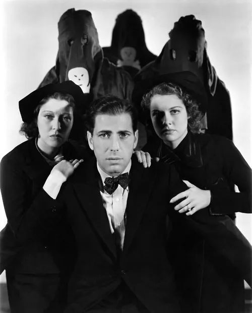 终于,在阿齐·梅奥尖锐的反三K党影片《黑暗军团》(Black Legion,1937)中,鲍嘉取得了突破,该片也成为他职业生涯早期的一个高光时刻。在电影史上的这个时间节点,这部影片的横空出世令人始料未及。尽管影片没有直接点名3K党,但片中的黑暗军团与3K党之间的相似性显而易见。鲍嘉饰演的弗兰克·泰勒(Frank Taylor)是一个上进的工厂工人,他发现自己的晋升道路受到了阻碍,梦寐以求的工作被一个波兰工厂的工人乔·东布罗夫斯基(Joe Dombrowski,亨利·布兰登Henry Brandon饰)夺了走。