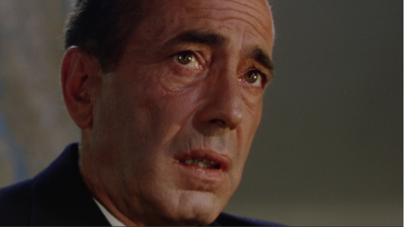 1954年,鲍嘉在爱德华·德米特里克(Edward Dmytryk)根据赫尔曼·沃克(Herman Wouk)的小说改编的《叛舰凯恩号》(The Caine Mutiny,1954)中扮演了菲利普·弗朗西斯·奎格上尉(Philip Francis Queeg)这一具有挑战性角色。奎格是一个低效且刻板的人,他反复无常、任性妄为地管理着凯恩号,交替下达命令又撤销命令,明明是自己无能却不假思索地指责身边的员工。通讯官托马斯·基弗中尉(Thomas Keefer,弗莱德·麦克莫瑞Fred MacMurray饰)说服史蒂夫·玛丽克中尉(Steve Maryk,范·强生Van Johnson饰)记录奎格的所有违规行为,这最终导致船员们在一场暴风雨中哗变,因为奎格因恐惧而瘫倒,无法指挥这艘船。奎格被带上法庭,在证人席上崩溃,整整五分钟的特写镜头揭示了他病入膏肓的妄想症,而船员们因此被无罪释放。这是鲍嘉最精彩的表演之一,为他赢得了第三次奥斯卡最佳男主角的提名,但他输给了出演伊利亚·卡赞(Elia Kazan)的《码头风云》(On The Waterfront,1954)的马龙·白兰度(Marlon Brando)。