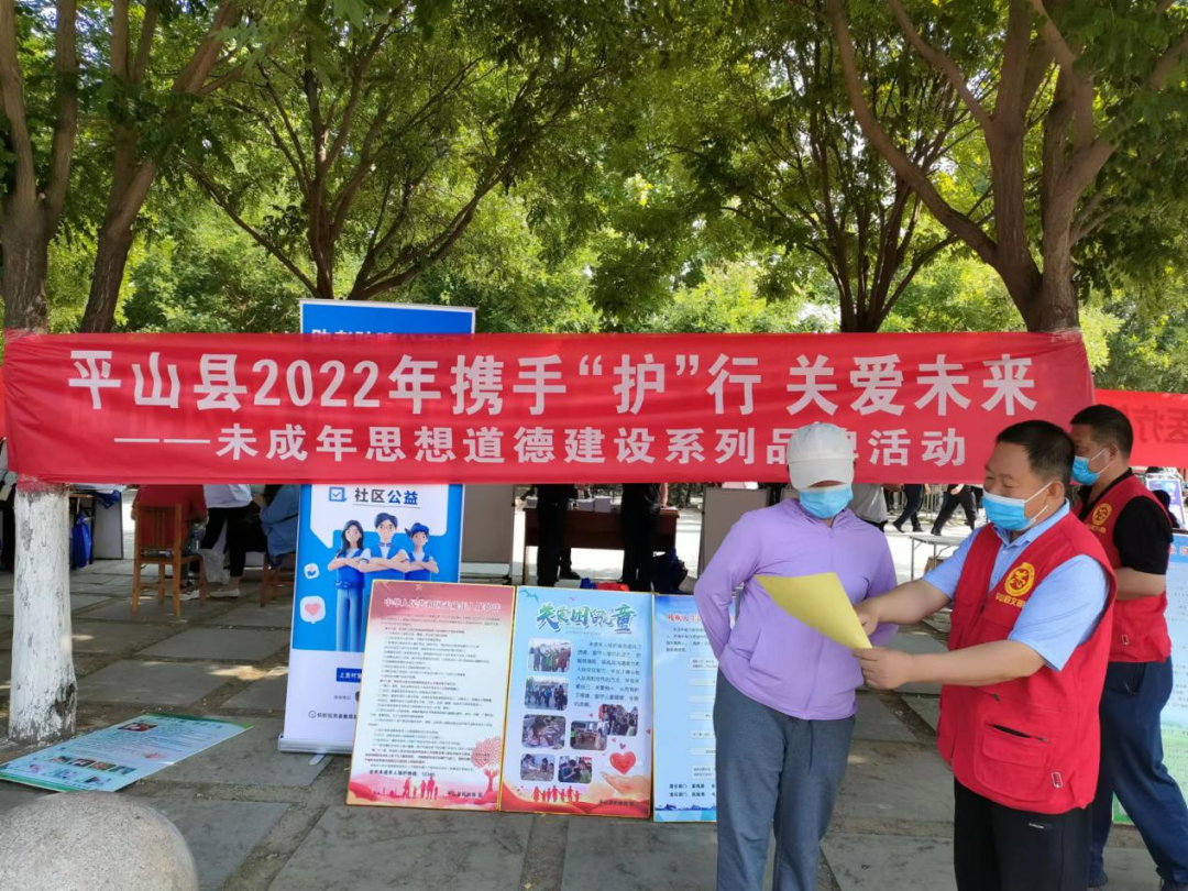 携手“护”行,关爱未来。近日,平山县预防青少年违法犯罪专项工作组成员单位平山县民政局在县城秀水公园开展未成年人保护法宣传活动。