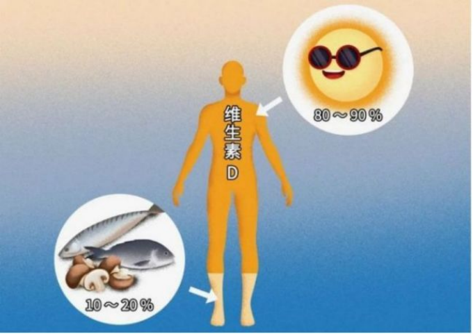 过往研究显示,人体获得的维生素 D 中,90% 以上都来源于晒太阳,皮肤中的 7-脱氢胆固醇在紫外线照射下可以转化为维生素 D,而剩余的维生素 D 则主要是从少量含维生素 D 的食物中获得的。