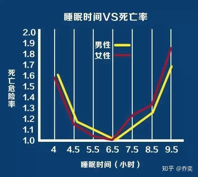1、缺觉、睡多了,对身体都不好“睡眠时间VS死亡危险率”的函数图显示,睡眠时间在6.5小时-7.5小时之间,死亡率最低,少于6.5小时或者高于7.5小时之后,死亡危险率都大大增高,尤其是睡眠时间超过9.5小时或少于4.5小时,死亡危险率翻倍。我们晚上睡觉是充电,白天是放电,如果晚上只充了50%的电,白天还要释放100%,那50%从哪儿来?就得从五脏借。有一句话叫“晚上不睡叫耗伤阳气,早上不起叫封杀阳气”。早早起床,只是在起床的那几分钟有心理矛盾,稍微一活动就会感觉不那么困了,体内阳气随着你的活动升起来了。2、熬夜等于慢性自杀“晚上11时不睡是不要脸,晚上12时不睡是不要命!”长期缺乏睡眠,会令人皮肤暗黄粗糙、免疫能力下降,加上熬夜都是久坐不动,增加了早早患上心血管疾病、高血压、中风、糖尿病等疾病的可能,同时还会导致失眠、健忘、易怒、焦虑不安等症状。