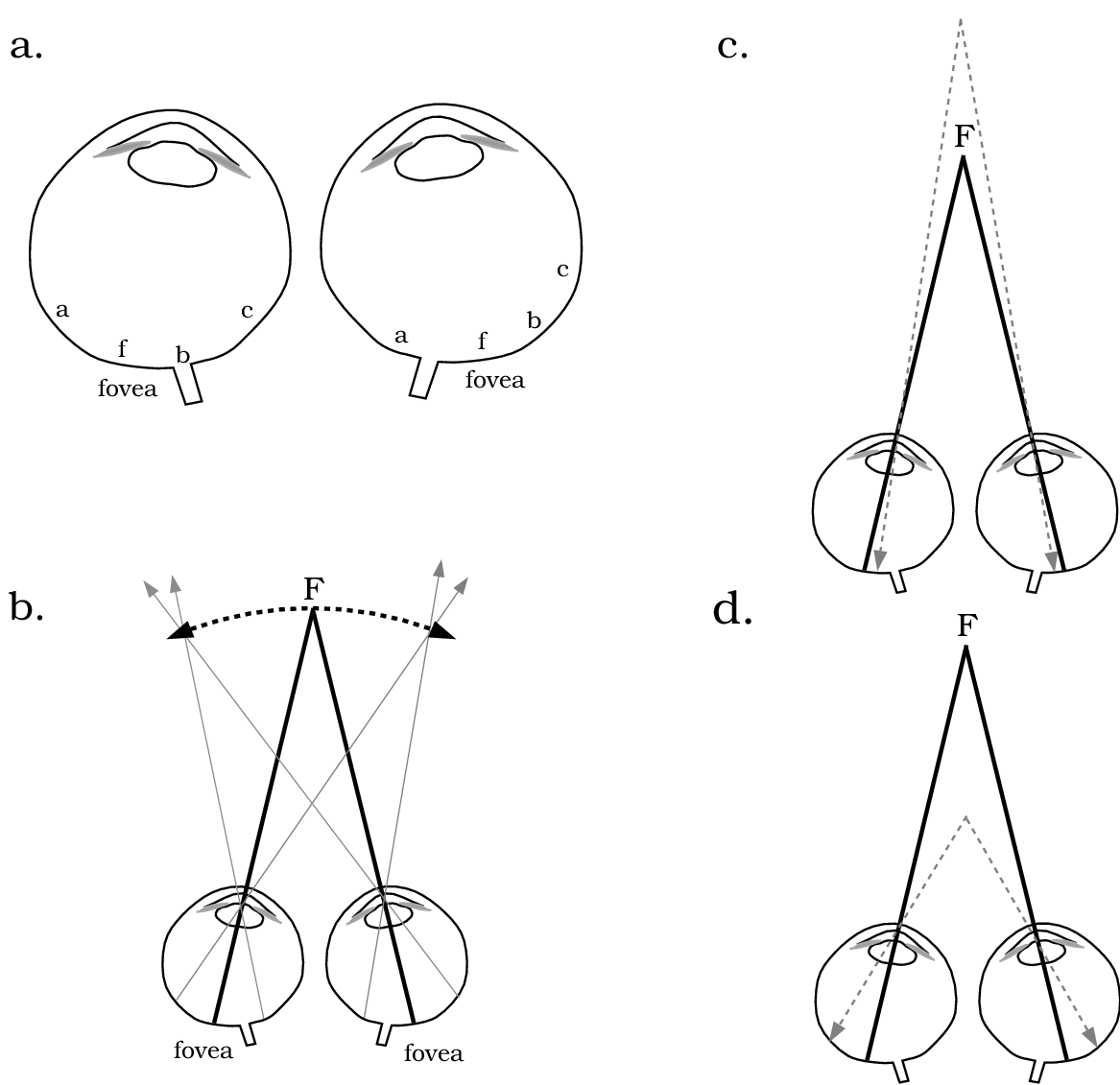 上图F指的是注视点(Fixation),你用眼睛看书的时候,肯定是两只眼睛注视同一个地方的。如果一个物体在Horopter上,那么他们在双眼呈现的位置是一样的(b),如果一个物体比你的注视点远,那么他在双眼上投射的位置如(c)。如果一个物体比你的注视点近,在双眼投射的位置如(d)。虽然你的两只眼睛看到的东西有差,但是两只眼睛还是集中于一点的。(Wandell, B. A. (1995). Foundations of vision. Sinauer Associates.)